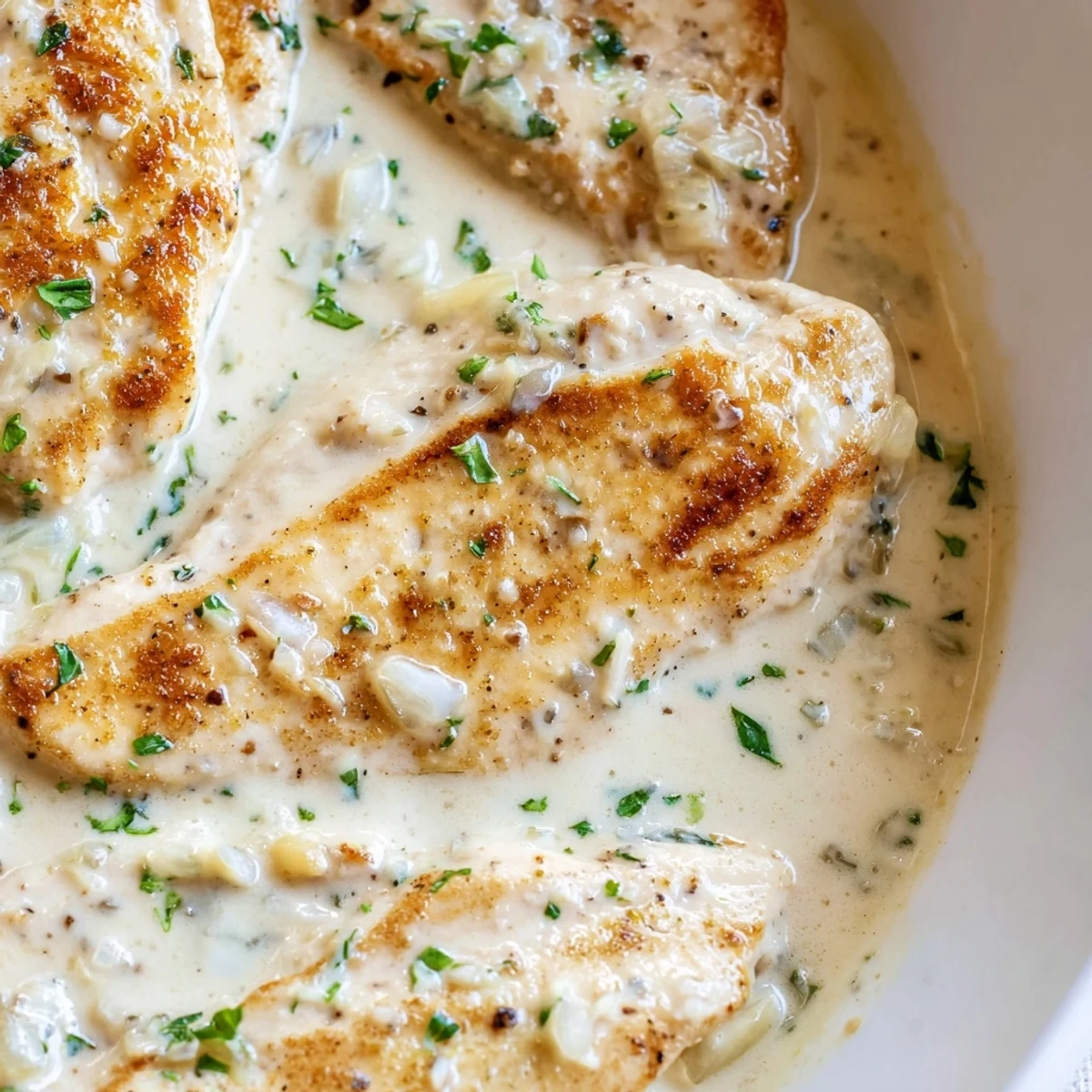 This comforting dish features golden pan-seared chicken breasts nestled in a velvety sauce made with heavy cream, Parmesan cheese, and aromatic garlic. The sauce develops deep flavor from sautéed onions and chicken broth, while Italian seasoning adds herbaceous notes.