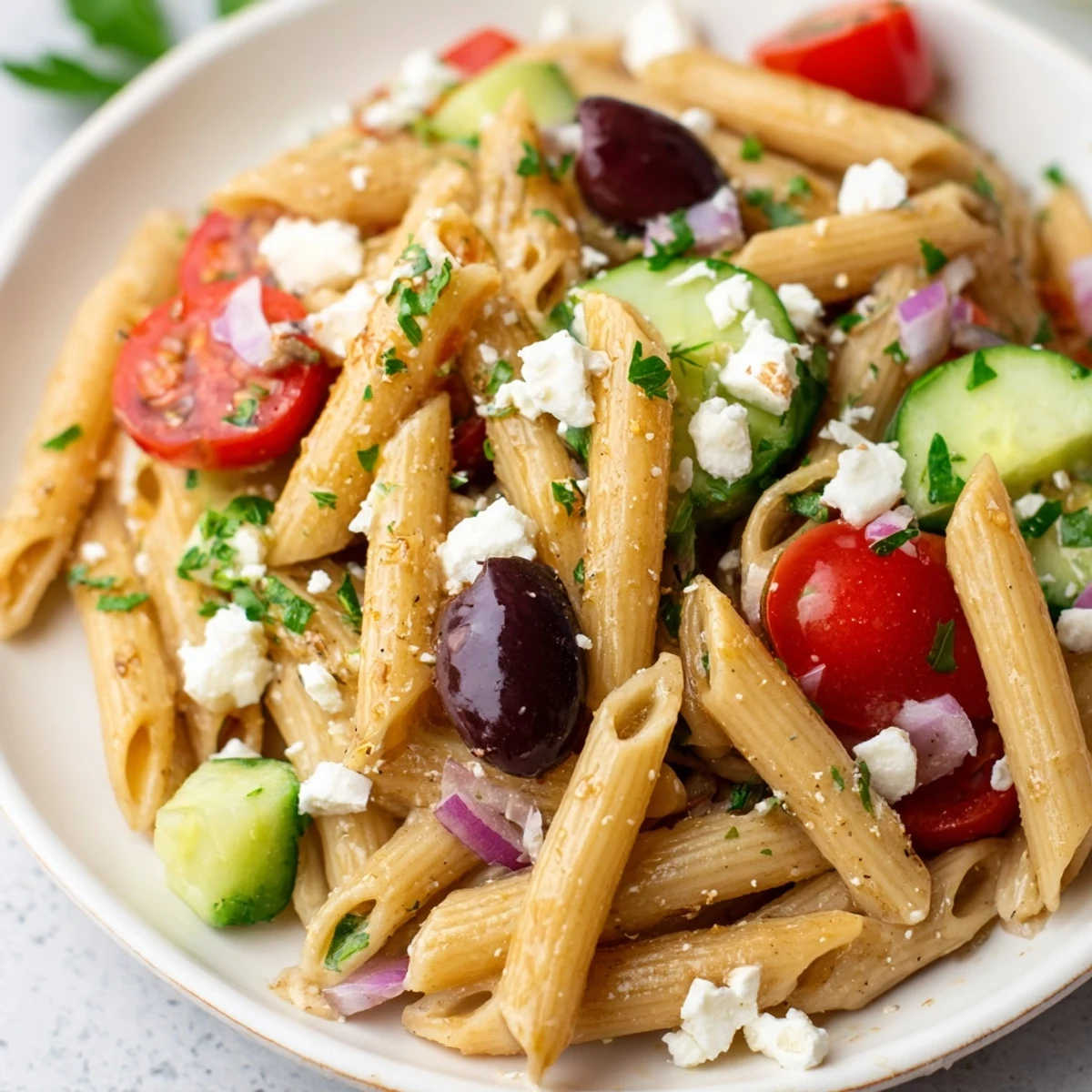 This refreshing Mediterranean-inspired dish combines al dente pasta with crisp cucumber, cherry tomatoes, red onion, bell pepper, and briny Kalamata olives. A tangy homemade dressing with extra-virgin olive oil, red wine vinegar, garlic, and dried oregano ties everything together.