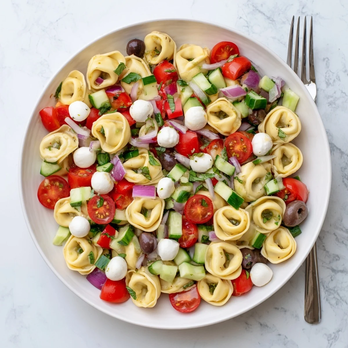 - Black olives and red onion: They add that briny, sharp kick that cuts through the creamy tortellini