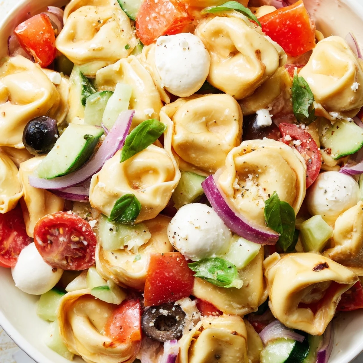 This vibrant salad brings together tender cheese-filled tortellini with crisp cherry tomatoes, cucumber, bell pepper, and red onion. Fresh mozzarella and Parmesan add richness, while a homemade zesty Italian dressing ties everything together with olive oil, red wine vinegar, and aromatic herbs.